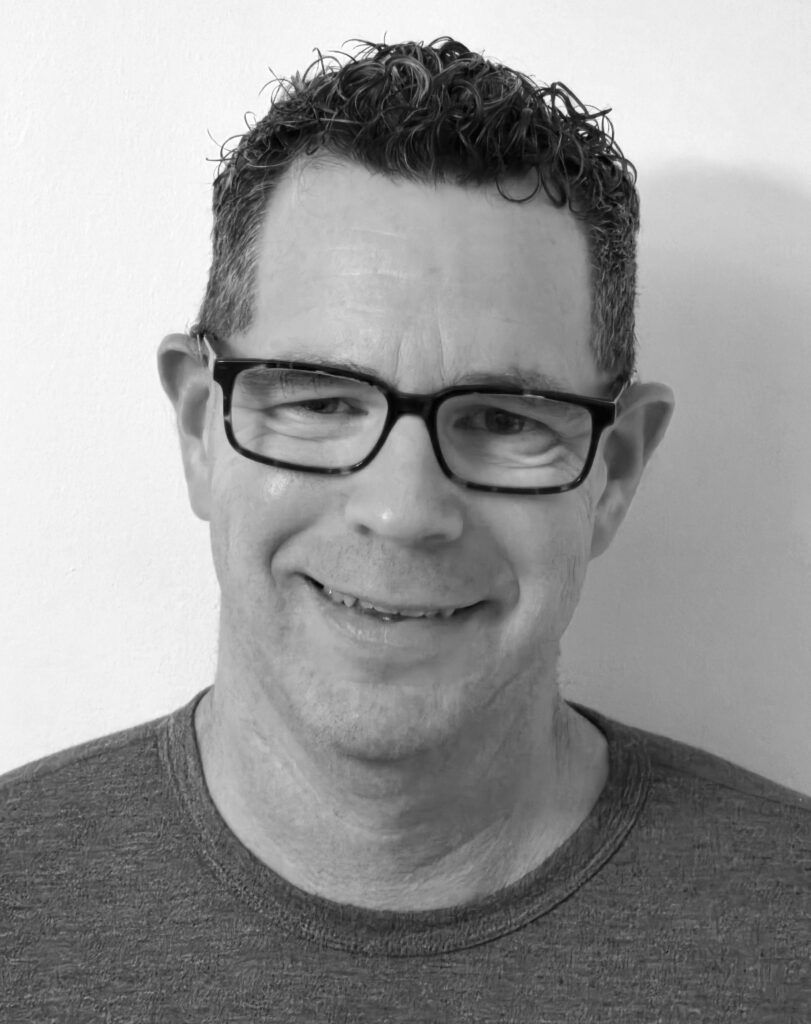 Black-and-white headshot of Brian Zandman smiling, gray hair, neck tattoo, checkered blazer