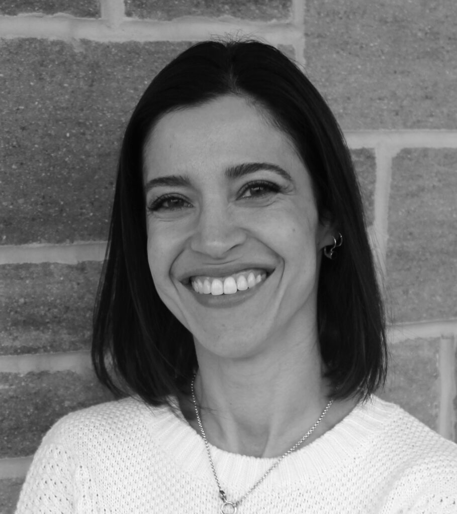 Professional headshot of Natalie Toth, a woman with long wavy hair, smiling brightly at the camera, wearing a dark top against a softly blurred indoor background, in black and white