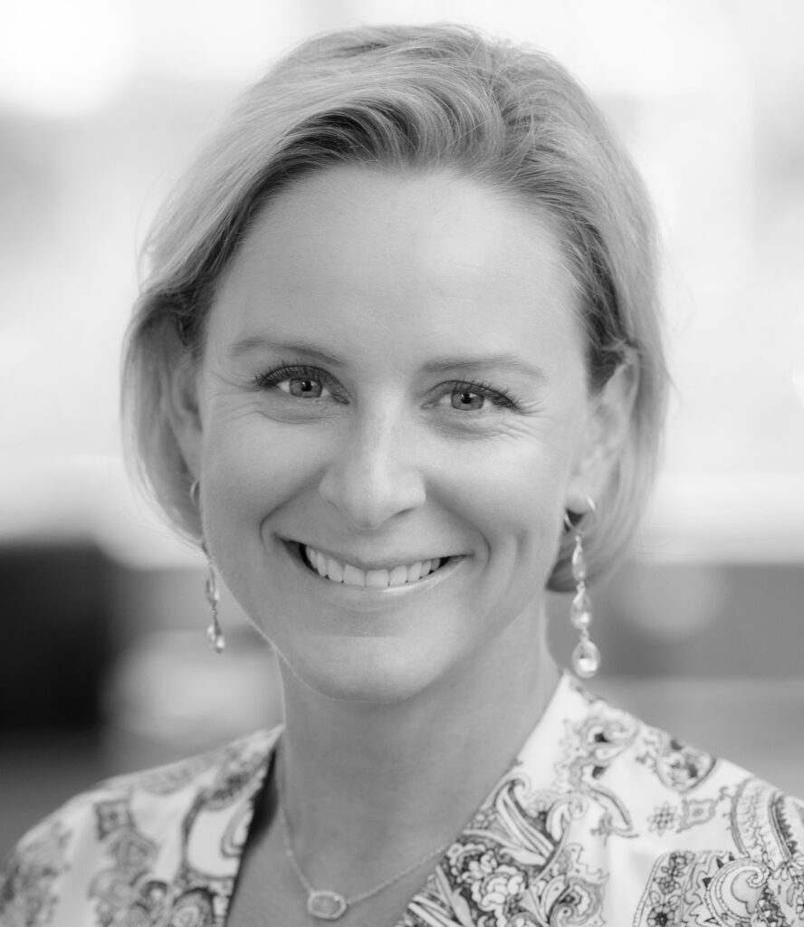 Professional headshot of Kate McBreen, smiling confidently at the camera, wearing a textured jacket, in black and white