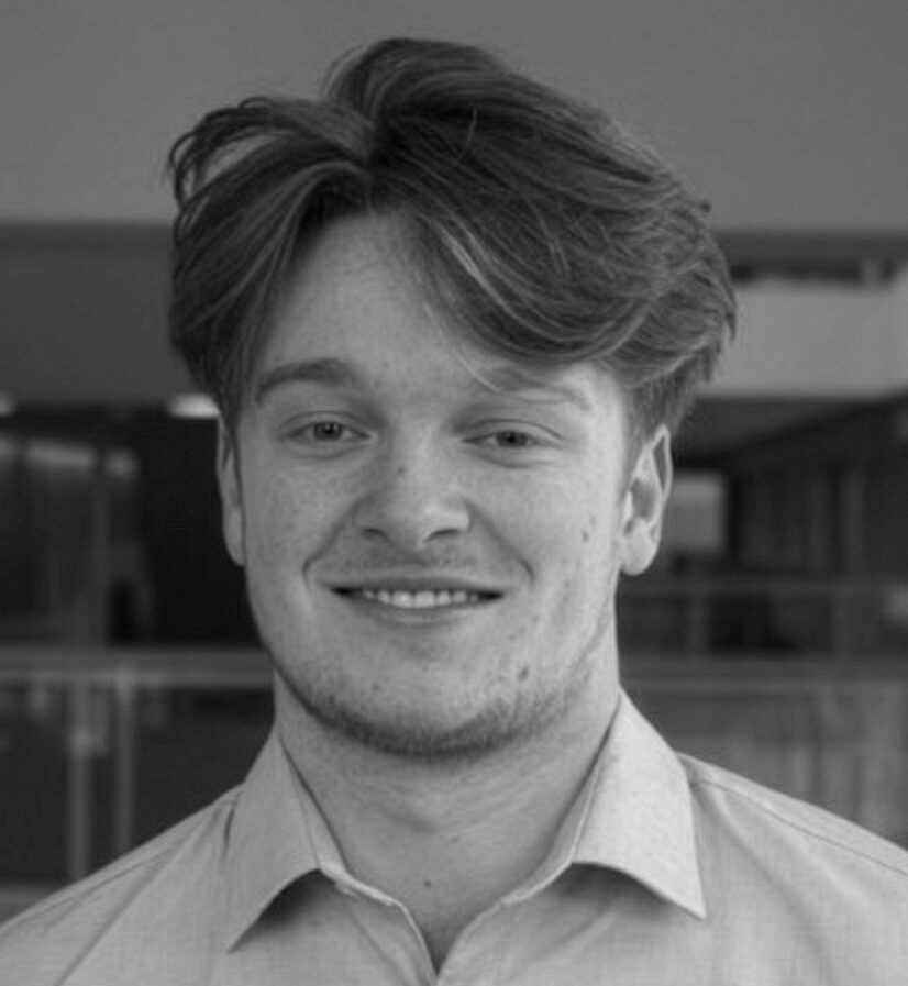Professional headshot of Drew Glenn, a man with short curly hair, smiling confidently at the camera, wearing a button-down collared shirt against a blurred neutral indoor background, in black and white