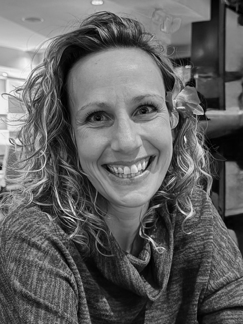Julie Walsh smiling in a black-and-white headshot, with long wavy hair, wearing large leaf-shaped earrings.